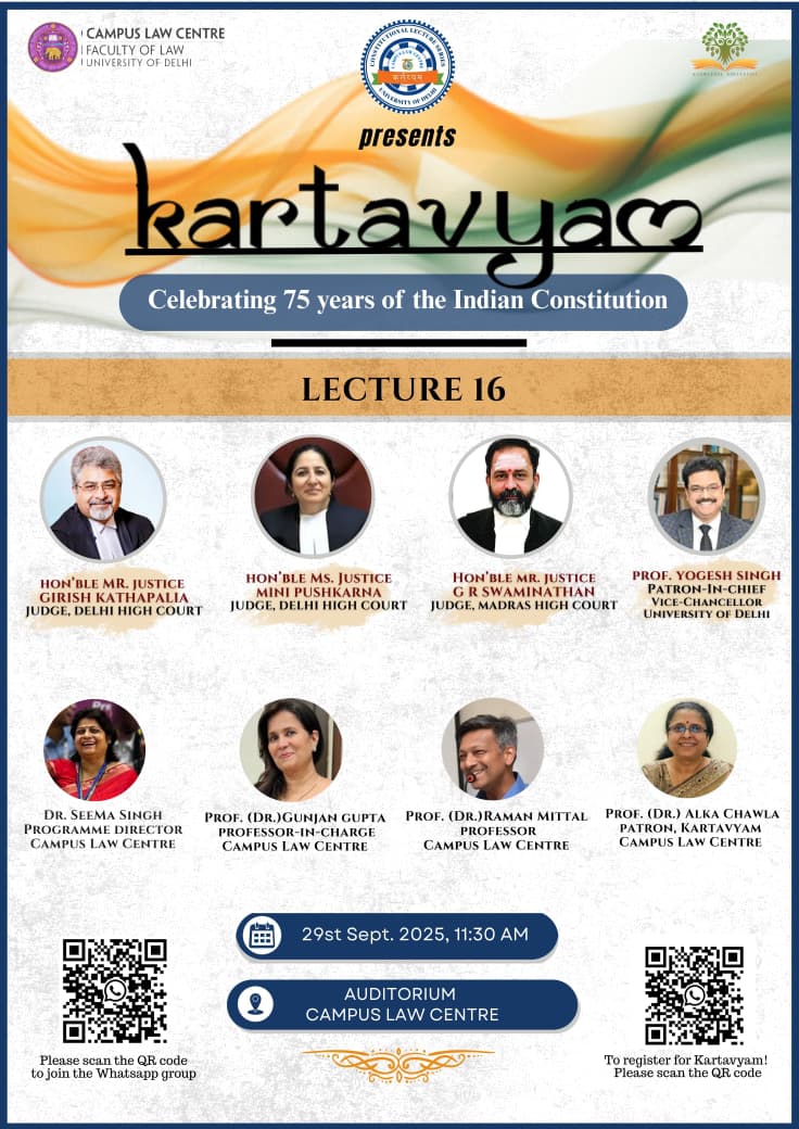 - Campus Law Centre present Kartavyam: A Constitution Lecture Series, Lecture No. 16, scheduled to be held at 11:30 AM on 29th September 2025 at Auditorium Campus Law Centre, University of Delhi.